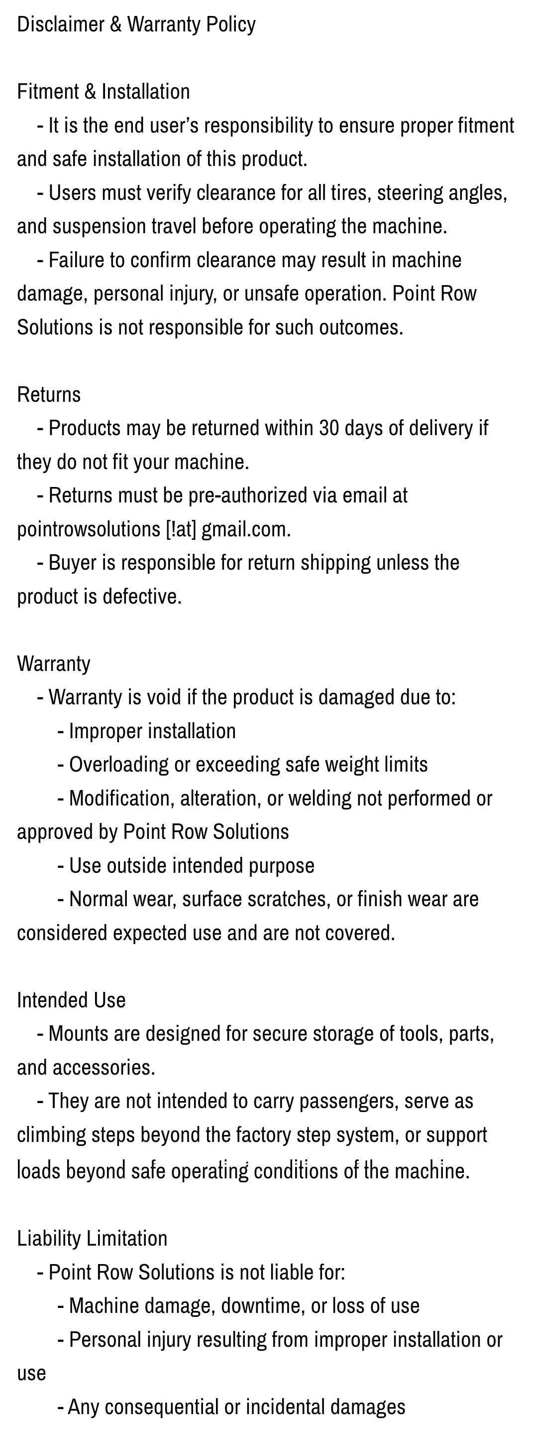 Disclaimer: Buyer is responsible for verifying fitment and safe installation before use. Warranty is void if damaged by improper use or installation. Returns accepted within 30 days if the mount does not fit. Please see product images for the complete disclaimer.