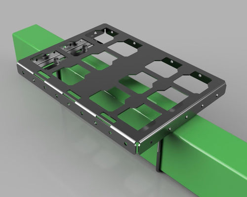 The PRS SaddleLite is a weight-mounted bracket designed to securely mount Milwaukee Packout boxes to John Deere tractors equipped with front suitcase weights using the standard 4-hole bolt pattern.